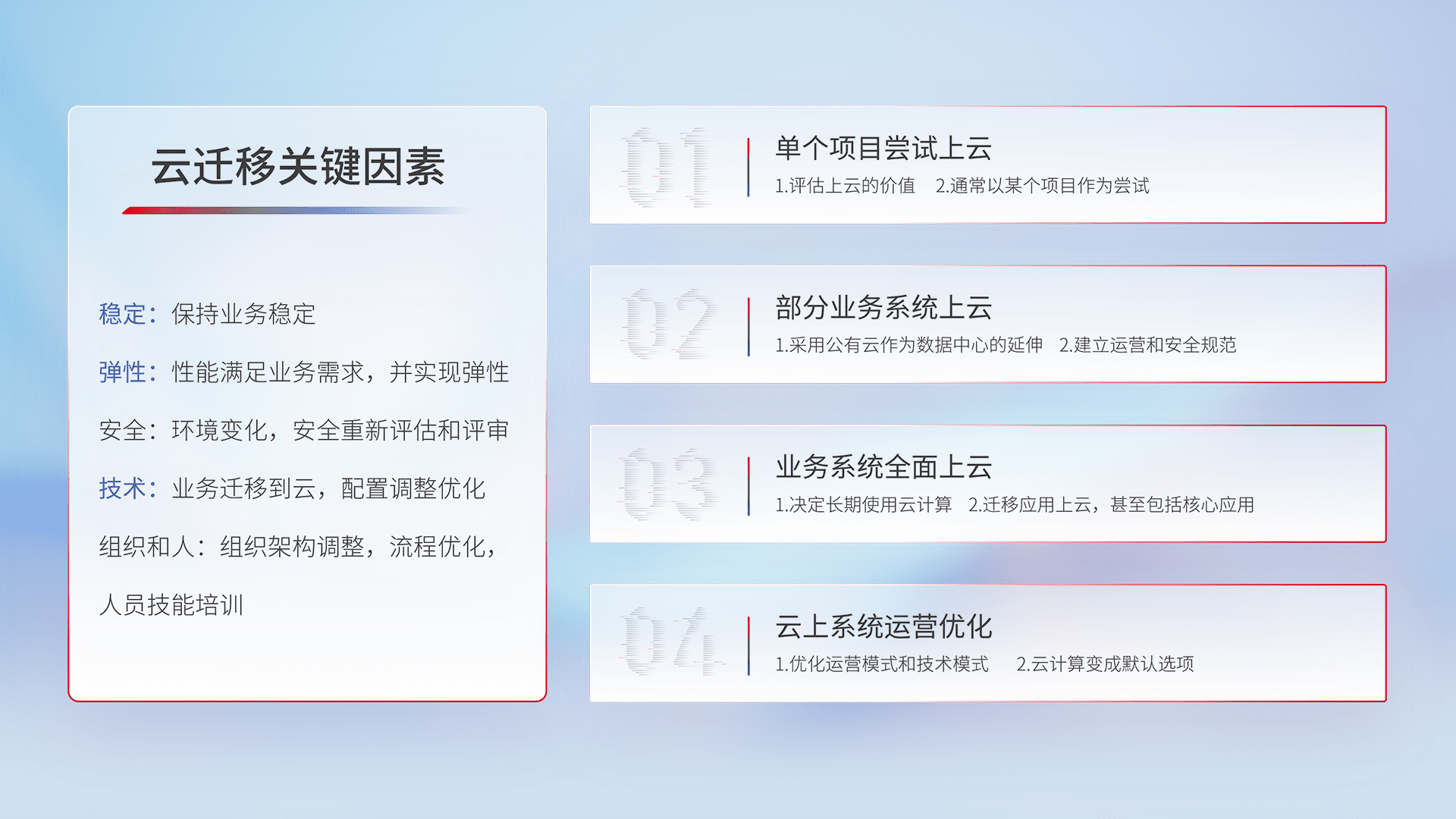 结合实际业务,,,,从规划设计、、云平台选型、、云原生改造、、数据迁移、、集成交付,,迁移全过程为客户识别最佳上云路径,,,做好风险识别管理,,设计网络架构、、、身份权限、、、安全审计合规、、、操作审计、、日志审计、、、监控告警策略、、、、多站点容灾设计等,,对云上基础设施进行整体规划,,提升IT治理水平,,,,以满足弹性、、、高可用、、、、高性能的需求。。