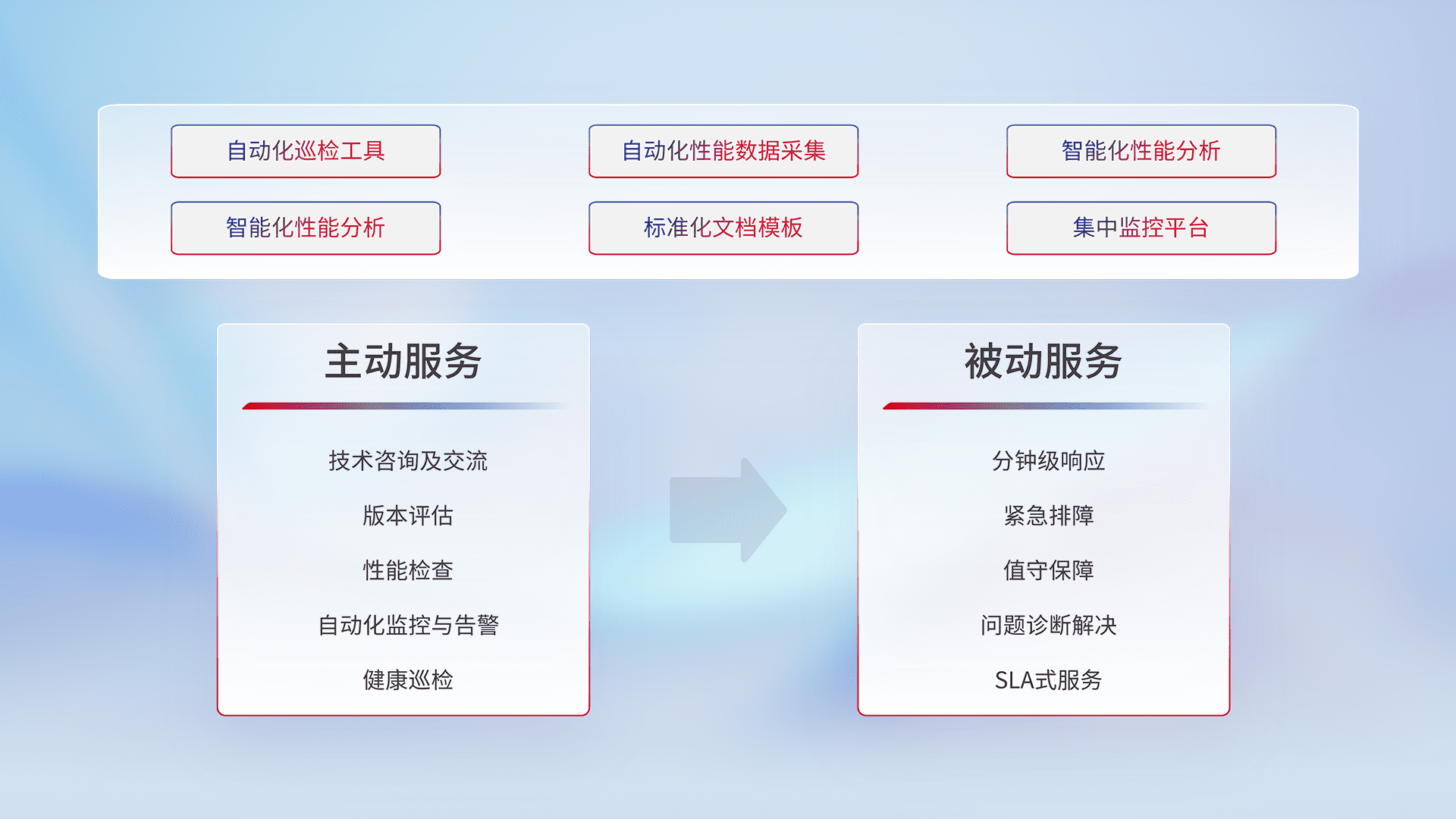 智能化工具和标准化文档,,保障服务质量,,提供主动服务(包含技术咨询、、版本评估、、、性能检查、、、自动化监控与告警、、、健康巡检)和被动服务包含(分钟级响应、、紧急排障、、、值守保障、、、、问题诊断解决、、SLA服务)。。。